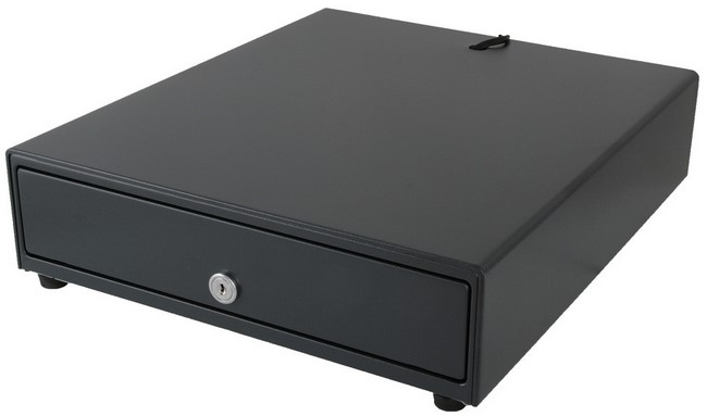 Metalowa szuflada kasowa średniej wielkości. Wyposażona w przewód łączący z kasą o długości 1,4 m zakończony złączem DC 2.1/5.5 oraz zamek trójpozycyjny (otwarcie szuflady kluczem, otwieranie elektromagnesem, zablokowanie kluczem). Szuflada aktywna.