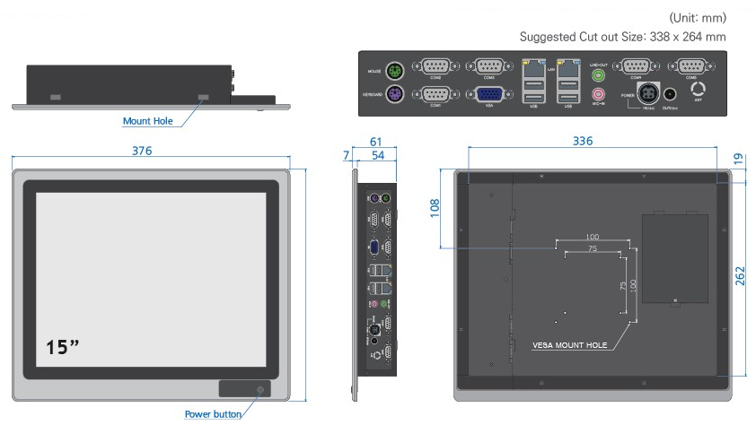 | Interfejsy | 4 x USB 2.0; 1 x D-SUB9 (RS232/422/485 – COM1) + 4 x D-SUB9 (powered COM2/3); 2 x PS/2; 1 x VGA; 2 x RJ-45 (10/100Mbps Giga LAN); Audio: Line out, Mic in |