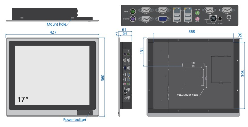 | Interfejsy | 4 x USB 2.0; 1 x D-SUB9 (RS232/422/485 – COM1) + 4 x D-SUB9 (powered COM2/3); 2 x PS/2; 1 x VGA; 2 x RJ-45 (10/100Mbps Giga LAN); Audio: Line out, Mic in |