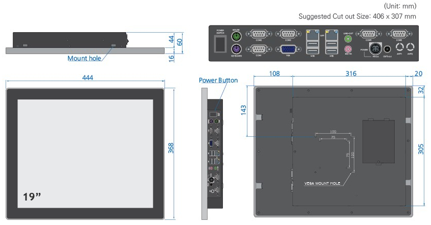 | Interfejsy | 4 x USB 2.0; 1 x D-SUB9 (RS232/422/485 – COM1) + 4 x D-SUB9 (powered COM2/3); 2 x PS/2; 1 x VGA; 2 x RJ-45 (10/100Mbps Giga LAN); Audio: Line out, Mic in |